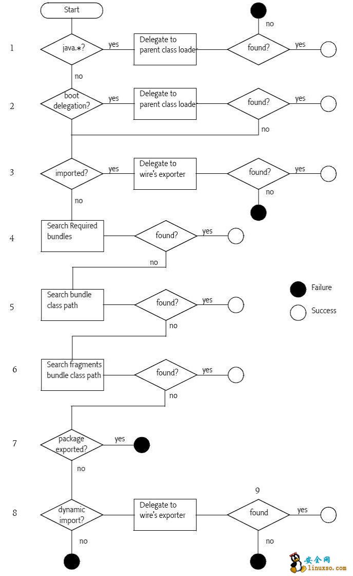 根据Bundle配置的import-package,判断目前需要加载的类是否在import-package中,如在则交由对应的 PackageSource进行加载,PackageSource在加载时即直接交由对应的Bundle的classloader去加载,如加载的类的 package在import-package中,但加载后仍然没有找到Class,则直接抛出ClassNotFoundException,如加载 到,则直接返回。