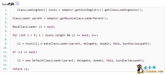 ClassLoadingHook在createClassLoader的时候都没有做动作,因此最后ClassLoader都是通过创建 DefaultClassLoader对象来构建的,其中parent参数为null,delegate参数为BundleLoader实 例,bundleclasspath参数为bundle的classpath。
