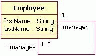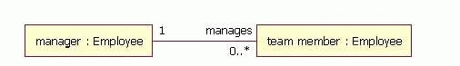 图描绘的关系说明一个Employee实例可能是另外一个Employee实例的经理。然而,因为“manages”的关系角色有 0..*的多重性描述;一个雇员可能不受任何其他雇员管理。