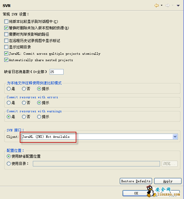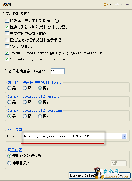"在windows下的eclipse里面Go to Preferences > Team > SVN > change the SVN interface to SVNKit (PureJava).” 然后就跟真进去看了。如下图所示: