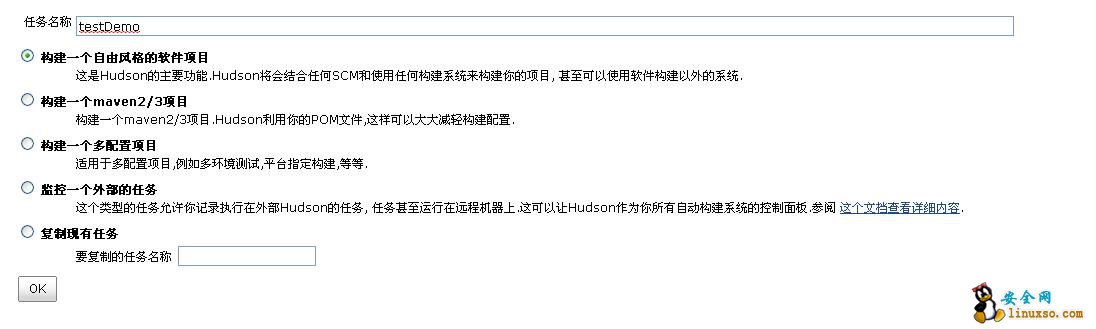 点击ok按钮,等待上传成功后关闭上传窗口。现在我们就能够在Hudson中新建一个构建项目了。打开浏览器,输入http://localhost:8080/hudson打开Hudson的主页,选择构建一个自由风格的软件项目,并给项目命名,这里使用testDemo。