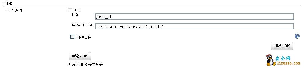 因为hudson中可以配置多个jdk,这里要先给这个jdk起一个别名以识别不同的jdk,我选择使用java_jdk。在下面的JAVA_HOME中输入环境变量中的JAVA_HOME变量的值就可以了。我们可以通过点击新增jdk按钮增加不同的jdk。