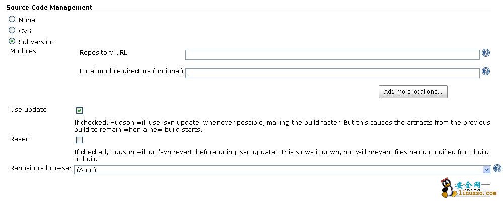 点击OK后,进入项目的配置界面,其中最重要的是Source Code Management,在其中选择Subversion后会有如下图的展开。