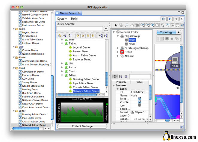 嵌入了Swing组件,可惜不够好看,直接把TWaver Demo放进来如何,于是拷贝TWaver Demo的源码,引用twaver.jar到build path,在createPartControl(Composite parent)中创建一个demo.MainPane,放到右边的面板中: