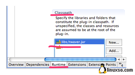 这里还有件重要的事要做,Eclipse RCP中使用第三方jar需要在Runtime Classpath中引入这个jar,可以按下图中的设置