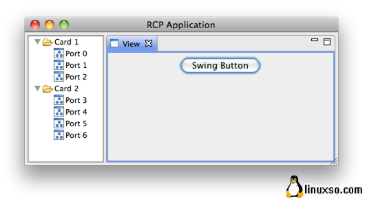 public class View extends ViewPart { public static final String ID = "HelloRCP.view"; private JPanel swingPanel; public void createPartControl(Composite parent) { Composite composite = new Composite(parent, SWT.EMBEDDED | SWT.NO_BACKGROUND); final Frame frame = SWT_AWT.new_Frame(composite); SwingUtilities.invokeLater(new Runnable() { public void run() { swingPanel = new JPanel(); JButton button = new JButton("Swing Button"); swingPanel.add(button); frame.add(swingPanel); } }); } public void setFocus() {} }