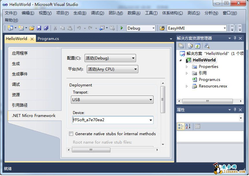 打开工程属性面板,选择【.NET Micro Framework】面板,设定usb方式,如下图: