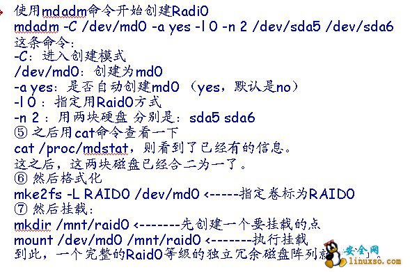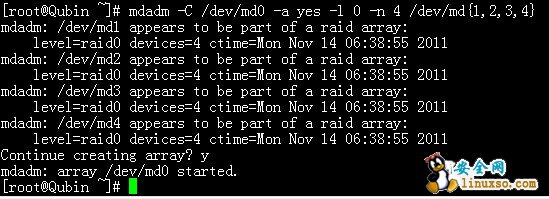 命令:]#mdam –C /dev/md0 –a yes –l 0 –n 4 /dev/md{1,2,3,4}