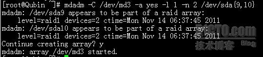 ]#mdadm –C /dev/md3 –a yes –l 1 –n 2 /dev/sda{9,10}