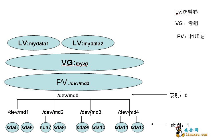 在很多情况下,LVM与RAID一起在使用。管理员可以按照下面的顺序建立一个RAID与LVM相结合的管理模式。
