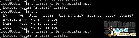 创建lv:]# lvcreat –L 1G –n mydata1 myvg 创建逻辑卷mydata1 大小1G,根据此命令可以创建多个。