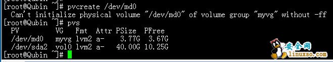 命令:]#vgcreate myvg /dev/md0 创建完成后,pvs可以查看到myvg