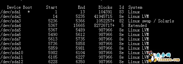 命令:]#fdisk /dev/sda 通过fdisk命令划分磁盘