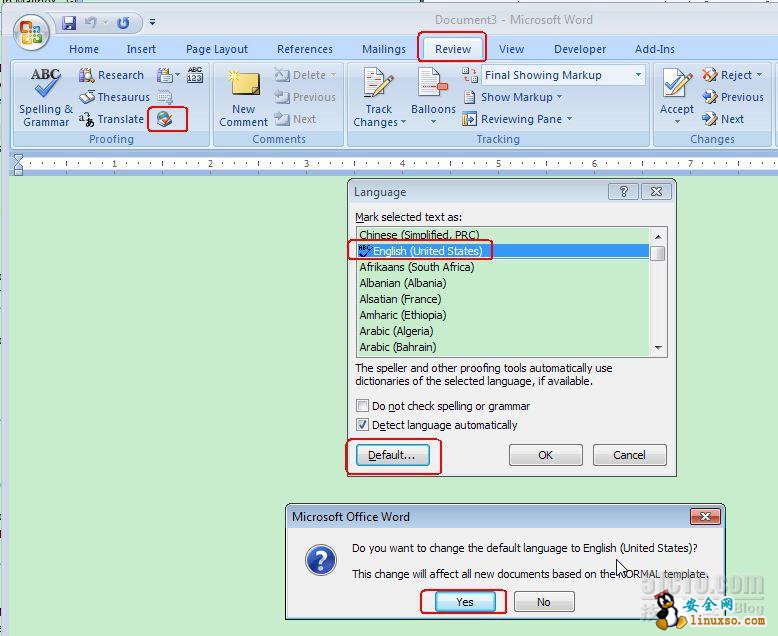 From the Review tab, in the Proofing section, click SET LANGUAGE