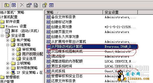 2.打开本地组策略(域服务器请打开域安全策略)找到如下设置,在以下三个策略中加入guest账号即赋予guest远程关机权限。