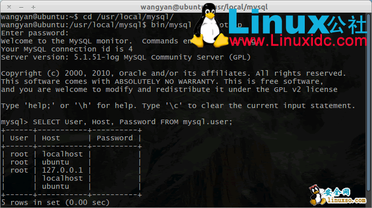 cd /usr/local/mysql/ bin/mysql -u root -p mysql>SELECT User, Host, Password FROM mysql.user; |
