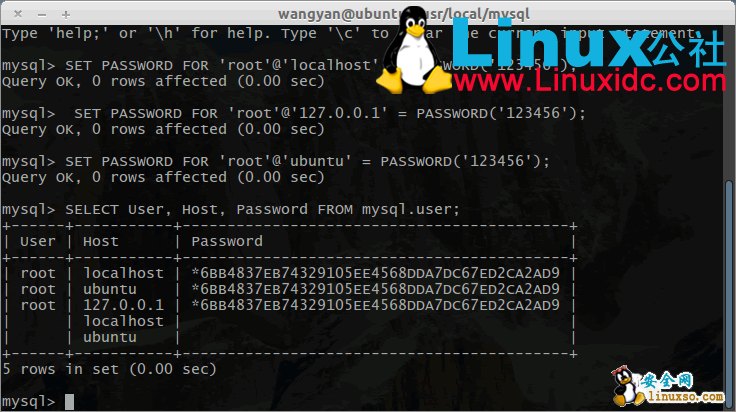 cd /usr/local/mysql/ bin/mysql -u root -p mysql> SET PASSWORD FOR 'root'@'localhost' = PASSWORD('123456'); mysql> SET PASSWORD FOR 'root'@'127.0.0.1' = PASSWORD('123456'); mysql> SET PASSWORD FOR 'root'@'Ubuntu' = PASSWORD('123456'); //ubuntu换为你的主机名 |
