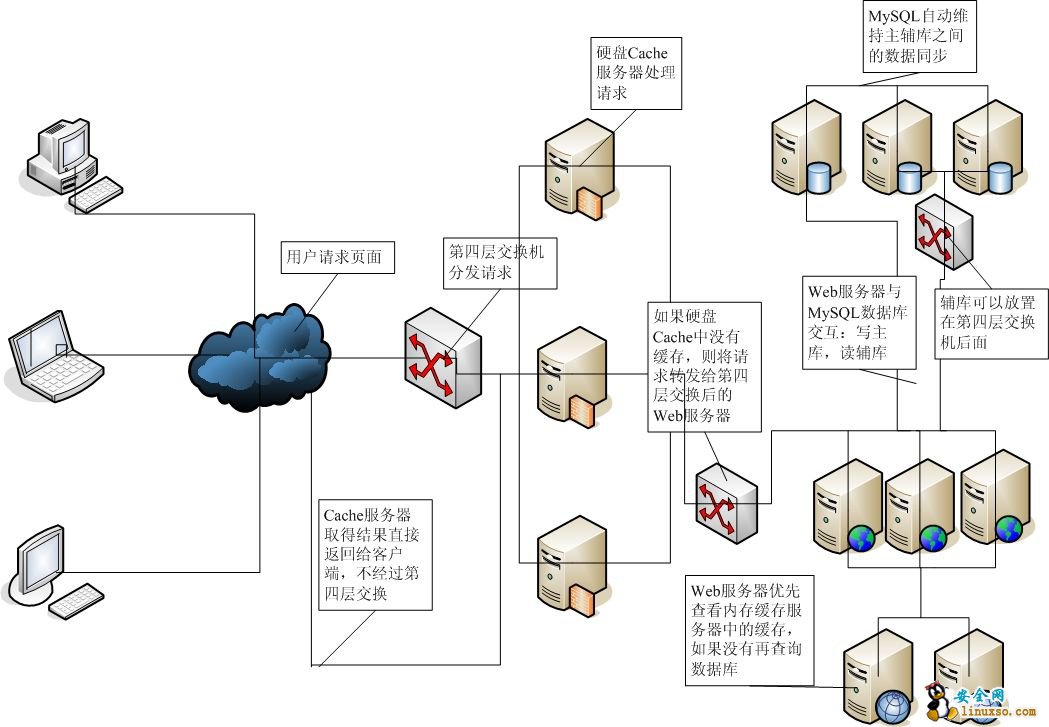 在这种架构下,每一级都是可以进行单独优化的,比如Lighttpd可以采用异步IO方式,Squid可以启用内存来缓存,Apache可以启用MPM (Multi -Processing Modules,多道处理模块)等,并且每一级都可以使用多台机器来均衡负载,伸缩性好。