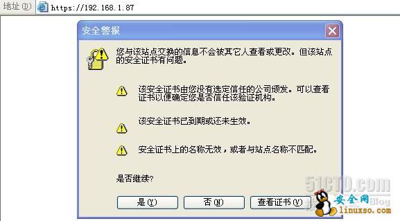 打开浏览器,在地址栏输入“https://服务器IP地址”或者“https://你的域名”后,如果出现提示安装服务器安全证书的窗口(如下所示),说明服务器已经支持SSL。