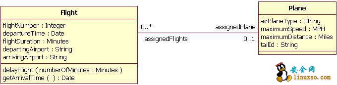 一个双向关联用两个类间的实线表示。在线的任一端,你放置一个角色名和多重值。图 6 显示Flight与一个特定的Plane相关联,而且Flight类知道这个关联。因为角色名以Plane类表示,所以Plane承担关联中的“assignedPlane”角色。紧接于Plane类后面的多重值描述0...1表示,当一个Flight实体存在时,可以有一个或没有Plane与之关联(也就是,Plane可能还没有被分配)。图 6 也显示Plane知道它与Flight类的关联。在这个关联中,Flight承担“assignedFlights”角色;图 6 的图告诉我们,Plane实体可以不与flight关联(例如,它是一架全新的飞机)或与没有上限的flight(例如,一架已经服役5年的飞机)关联。