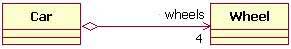 图中清楚的表明了类Car对象包含了另一类Wheel的4个实例,这两者在概念上是密不可分的,其中的一个类是另一个类的构成成分。菱形表示“包含”,箭头表示被包含的对象,数字4表示包含的数目。