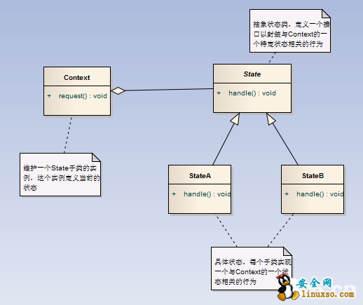 public class Context { public State state; public Context(State state){ this.setState(state); } public void setState(State state){ this.state = state; System.out.println("当前状态:" + state); } public State getState(){ return this.state; } public void request(){ state.handle(this); } }
