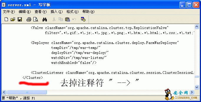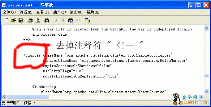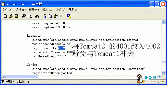 1. 修改tomcat1, tomcat2的server.xml,将集群部分配置的在注释符删掉,并将tomcat2的4001端口改为4002,以避免与tomcat冲突,当然,如果是两台电脑,是不用改端口的,去掉注释符即可