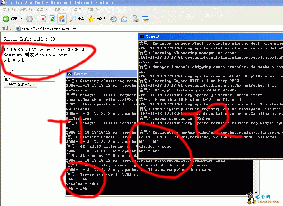 新建一个 名称为 xiaoluo ,值为 cdut 的session,提交查询,新开一个ie窗口,再提交查询,如图,可以看到,两个tomcat 是负载均衡,并且session同步的