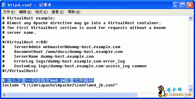 2. http.conf 同目录下新建mod_jk.conf文件,内容如下