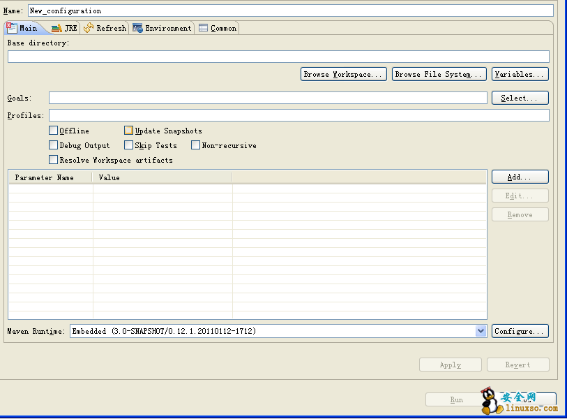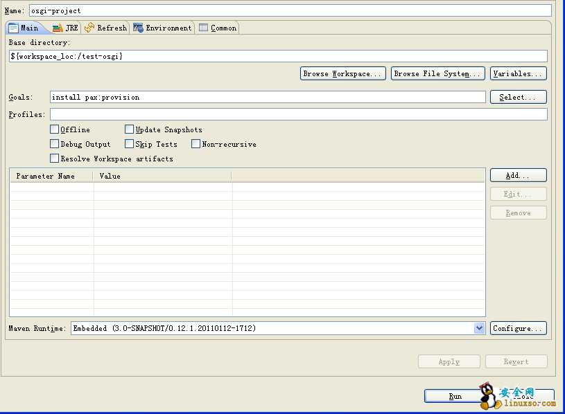 在该图示中,可以选择使用Browse Workspace或者 Browse File System来选择项目,在此可以使用Browse Workspace来选择我们新建立的项目。在Goals中输入 install pax:provision。
