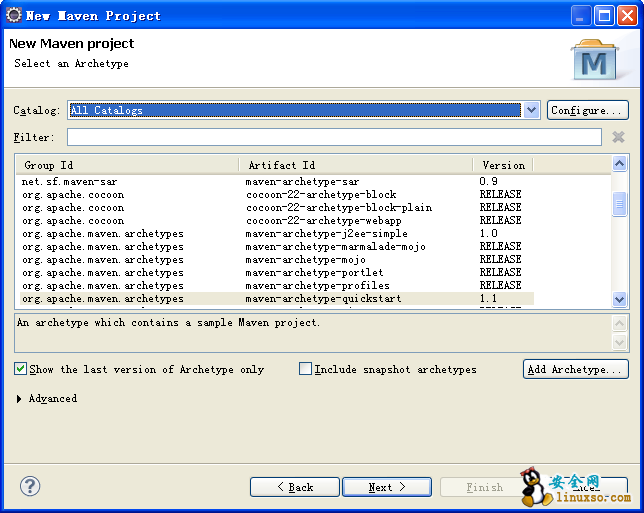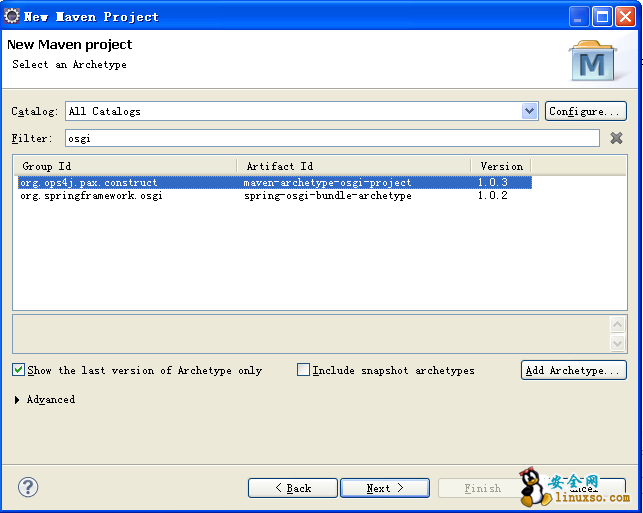 输入Group Id 和Artifact Id,点击Finish完成。 (找到工程下父级pom.xml文件,删除 maven-pax-plugin 插件的版本信息,也就是删除<version></version>该元素。可以使用Maven install 进行验证。 )
