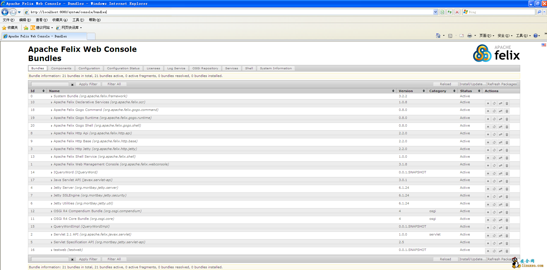 该页面显示出了bundle的信息。可以对bundle进行stop、update、uninstall等操作。