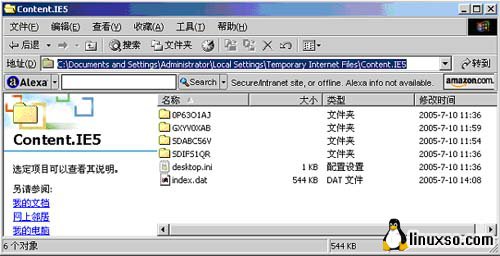 系统为了保密是不会让你直接看到这些地方的index.dat文件的,就算你在文件夹选项中设置成了让系统显示所有文件和不隐藏受操作系统保护的文件,也同样看不到也搜索不到它们。你可以试着进入IE的临时文件夹“Temporary Internet Files”,但在窗口地址栏的“Temporary Internet Files”后面手工加上“\Content.IE5”,便能发现该文件夹下面居然还有别的文件和文件夹,index.dat文件也是其中之一(如图1)。
