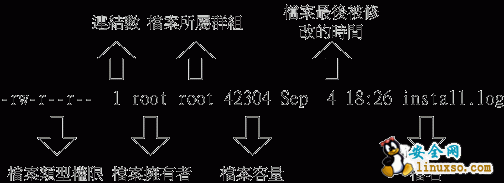 第一組為『檔案擁有者的權限』,以『install.log』那個檔案為例, 該檔案的擁有者可以讀寫,但不可執行;