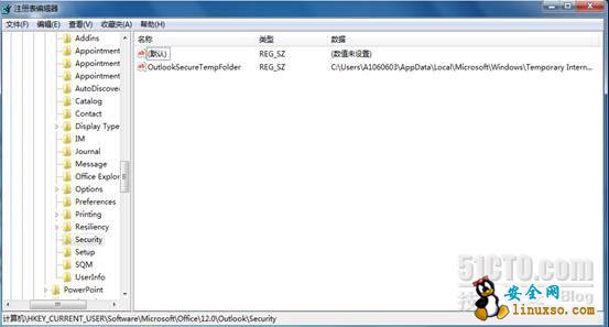 打开注册表并定位到:HKEY_CURRENT_USER\Software\Microsoft\Office\12.0\Outlook\Security\(2003版outlook为11.0)