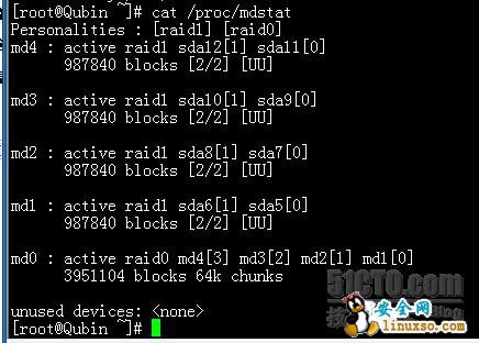 到了这里我们已经创建好了我们所有的raid盘,利用]#cat /proc/mestat可是查看到