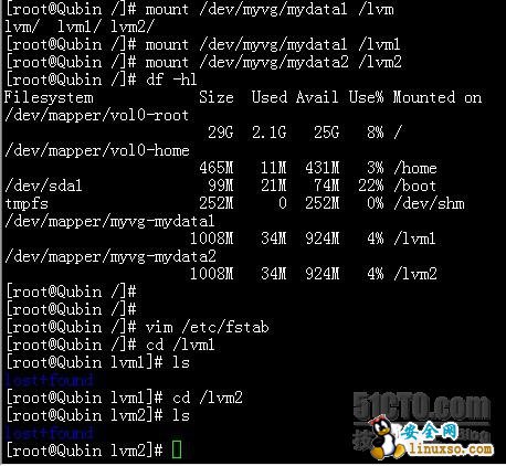 格式化完成后,我们再通过mount命令挂在到我们的目录就完成了整个管理模式的创建。我把刚刚创建的lv挂在到了/lvm1与/lvm2