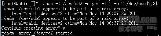 ]#mdadm –C /dev/md2 –a yes –l 1 –n 2 /dev/sda{7,8}