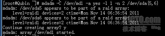 ]#mdadm –C /dev/md1 –a yes –l 1 –n 2 /dev/sda{5,6}