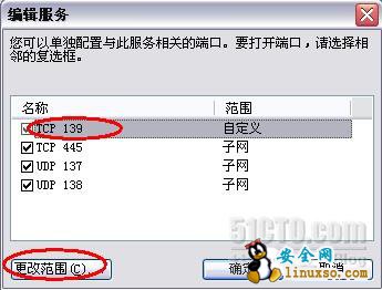 3. 在弹出的“编辑服务”窗口中,选择“TCP 139”,并单击“更改范围”;
