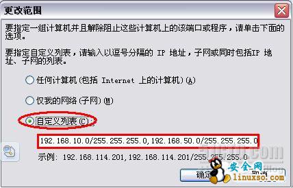 4. 在弹出的“编辑服务”窗口中,选择“自定义 列表”,输入“192.168.10.0/255.255.255.0,192.168.50.0/255.255.255.0”(意思是允许 192.168.10.0与192.168.50.0这两个网段可以共享此打印机。也可以设置一个地址, 如:192.168.50.100/255.255.255.0,只允许192.168.50.100共享此打印机),确定,xp上的操作算是结束了。