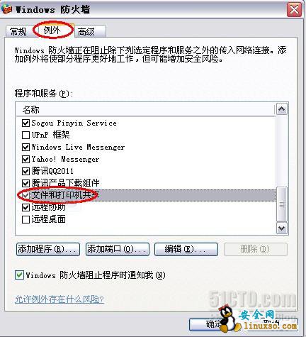 2. 选择“windows防火墙”中的“例外”选项卡,双击“文件和打印机共享”;