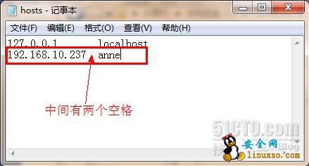 1. 进入“C:\Windows\System32\drivers\etc”目录,找到hosts文件,用记事本打开,在该文件末尾另起一行,添加“192.168.10.237 anne”(此外是xp的IP与计算机名),保存并重启(修改host文件,好像要重启才能生效)。
