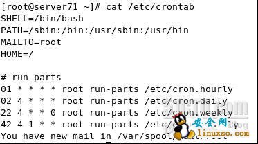 如果我们需要周期性的任务计划我们该怎么办呢?比如每天执行某个操作。周期性任务计划是借助周期性服务守护进程来实现,这个服务叫做crond。我们怎么进行周期性计划呢?其实在系统定义里两个周期性任务,一个是系统周期性任务,一个是用户周期性任务。系统周期性任务的配置文件保存在/etc/crnontab,,用户周期性任务/var/spool/cron/USERNAME