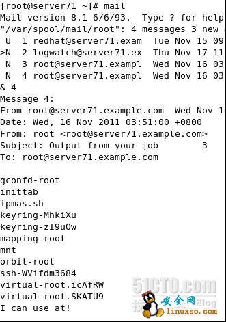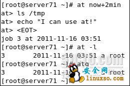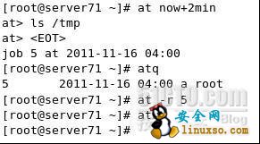 我们可以使用at和batch来执行一次性的某个任务,at可已接受的时间方式有很多种,你可以使用绝对时间,也可以使用相对时间,甚至可以使用模糊时间,废话不说,我们俩解释一下at的使用。比如我们需要在从现在开始2分钟以后执行ls /tmp 并且echo "I can use at"。我们直接输入at now+2min回车,输入命令后按Ctrl+D跳出,这样at命令就执行成功,3分钟后命令会执行,并发送一分邮件给自己。