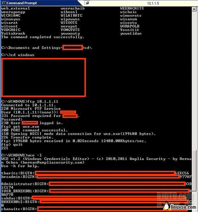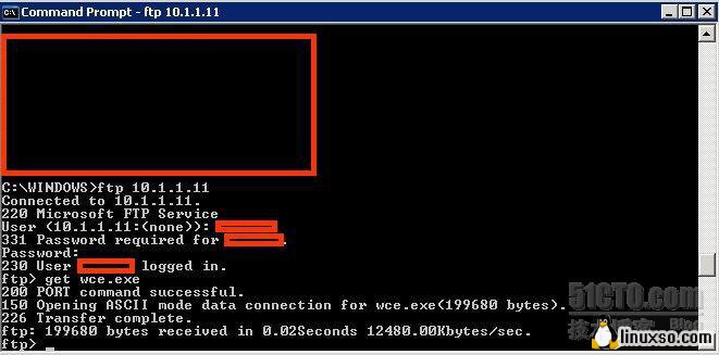 获得了域用户的HASH,就用工具配合彩虹表破解,1分钟左右,密码就出来了。登陆域控主机,使用FTP把WCE软件传过来