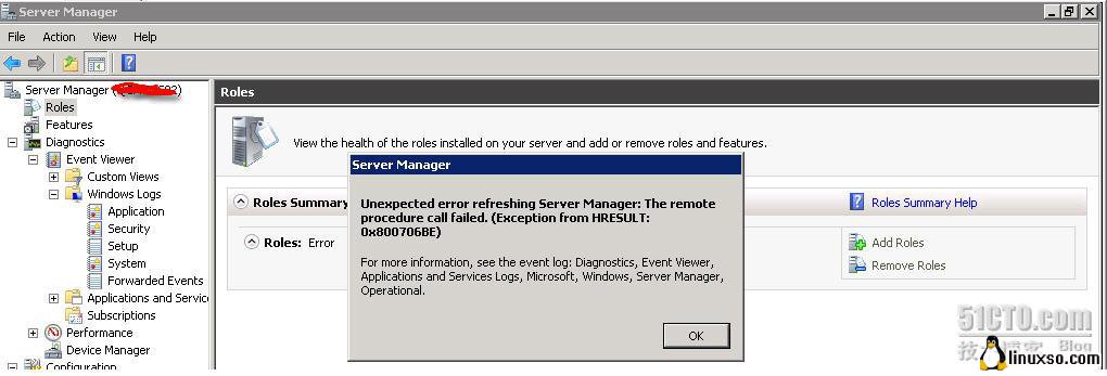 公司在重庆建立新厂,同时AD环境在重庆站点也建立两台DC。系统版本为Windows 2008R2(未带SP1),在将一台提升为DC后,发现有错误。角色无法开启,如下图: