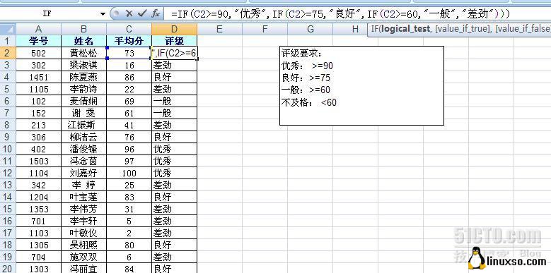 现在我们来修改一个实例要求,大于等于90的评级为优秀,大于等于75的为良好,大于60的为一般,小于60的统一为不及格,其IF公式则需要修改为: