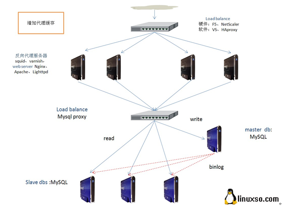 很多用户访问,读与写操作比例很大,如图2-2-1-3所示,通过在web server层上增加缓存,可以提高访问速度。比如可以缓存css、jpg等静态文件。