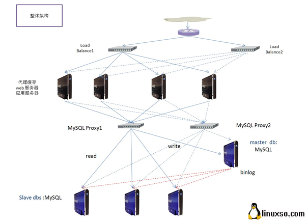 考虑到读写比例大的特点,如图2-2-1-3所示,通过增加db proxy,以及master-slaves ,实现读写分离,所有写操作在master db上进行,所有读操作在其他slave dbs 上进行,这样做有以下好处:
